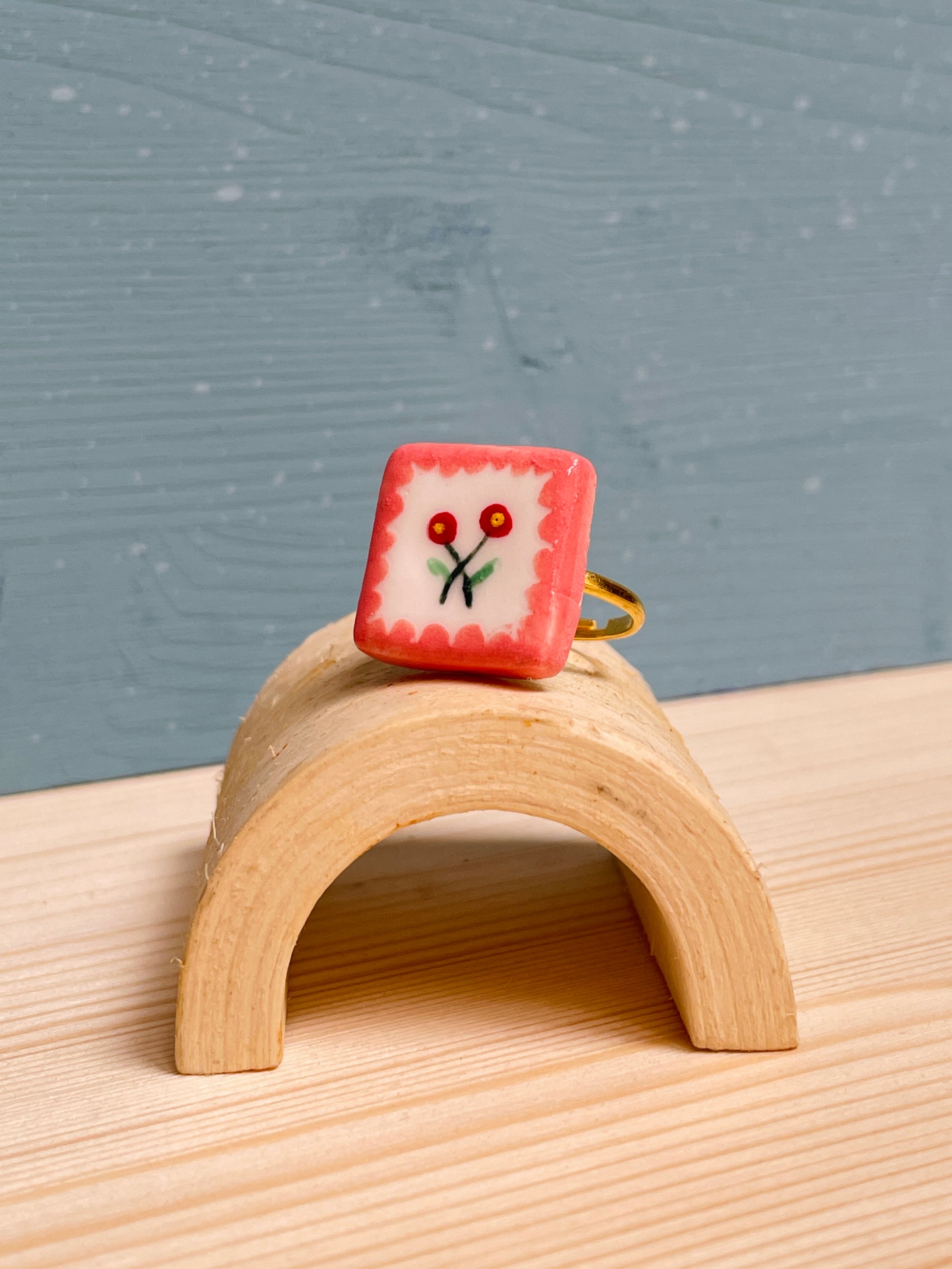 Anello in porcellana decorato a mano con supporto in acciaio inossidabile.
