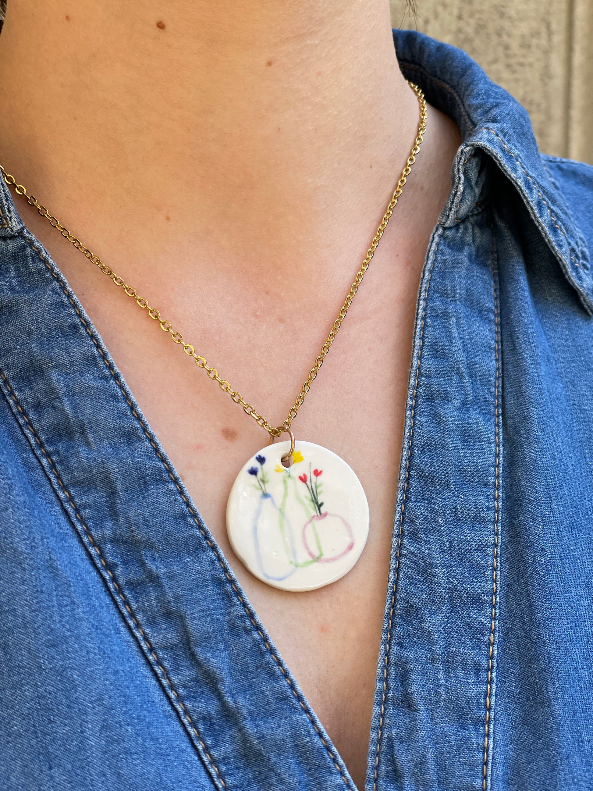 Collana in acciaio inossidabile con ciondolo in porcellana decorato a mano