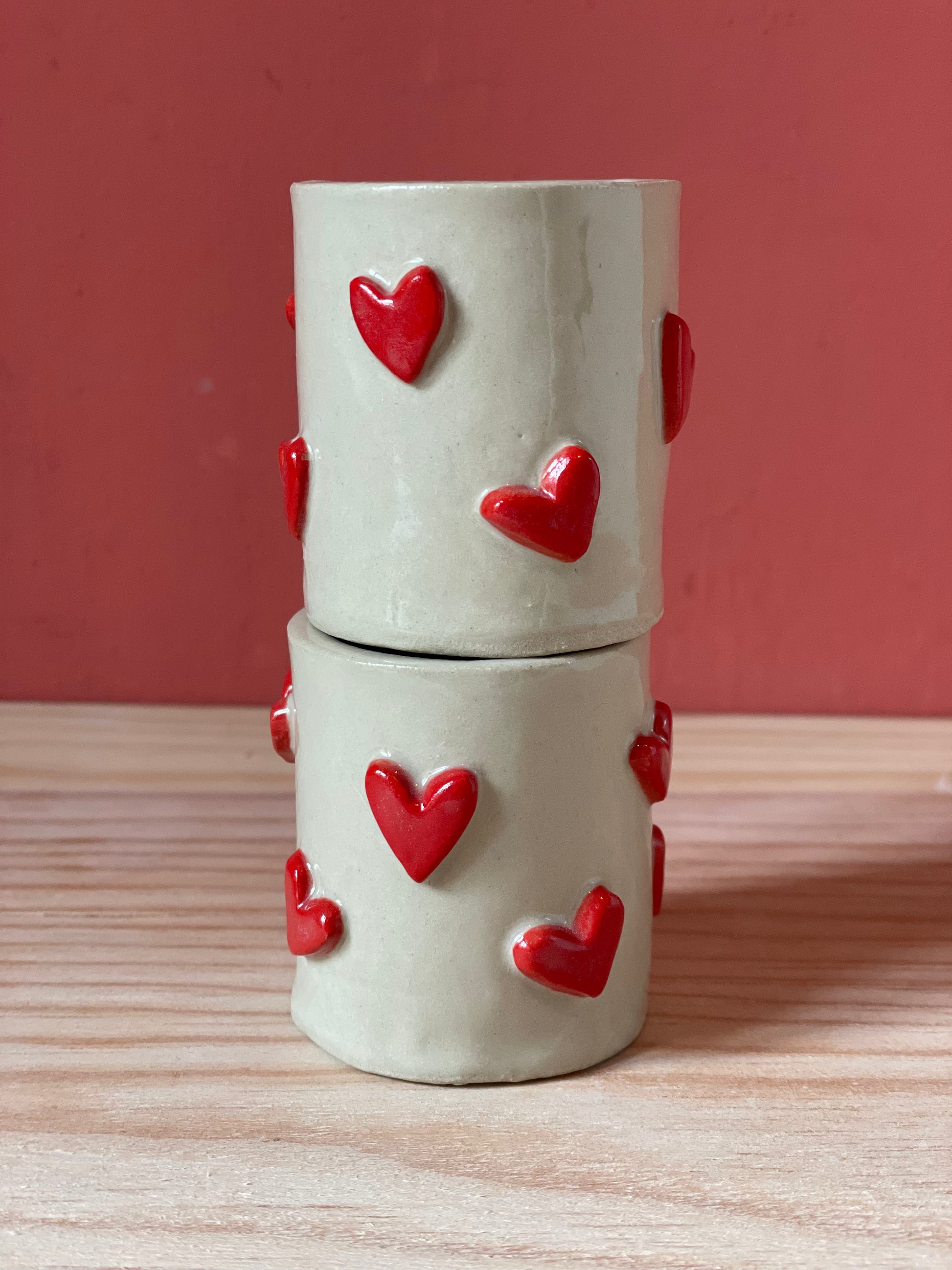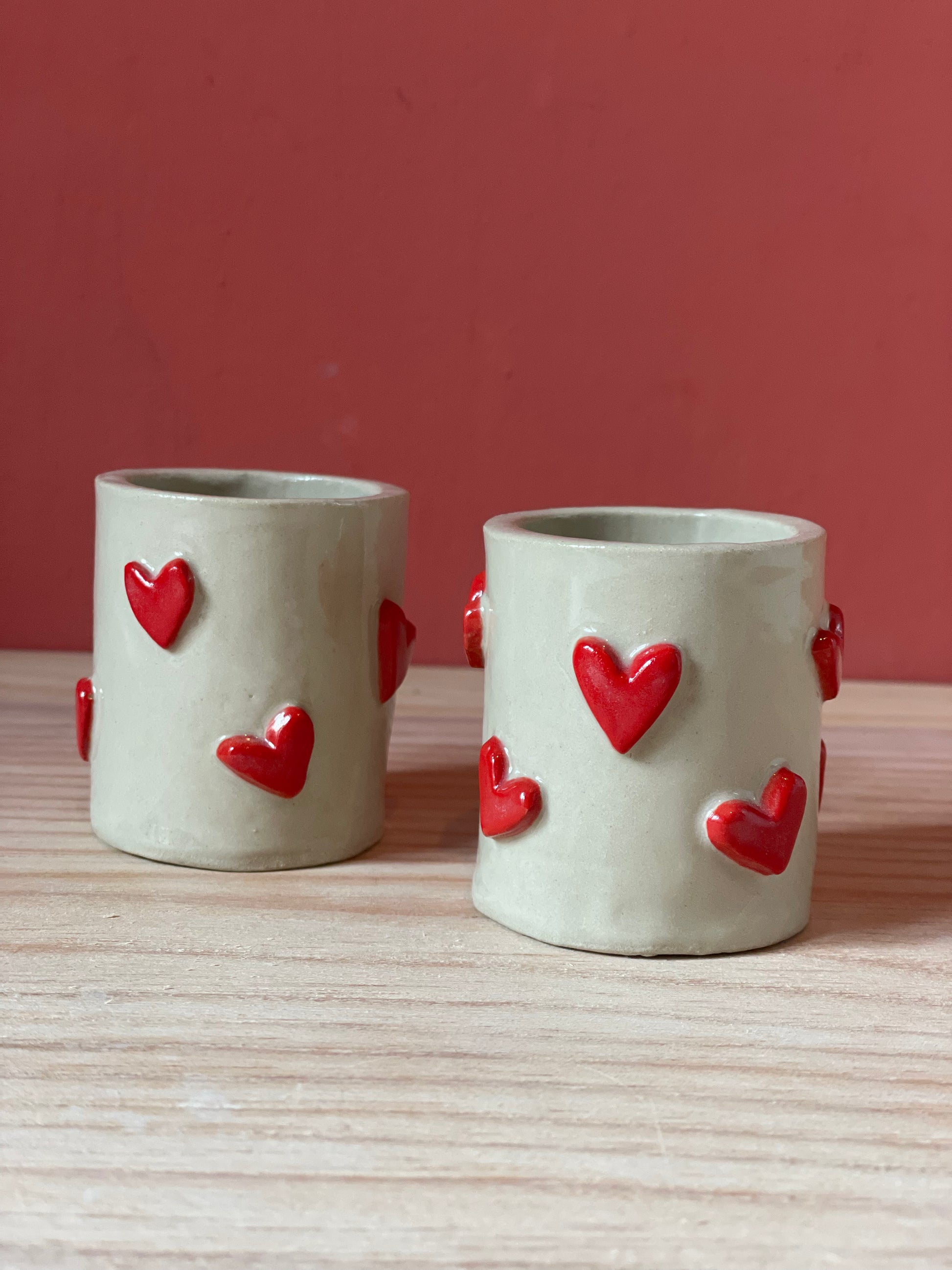 Coppia tazzine in grès con cuoricini realizzate e decorate a mano.
